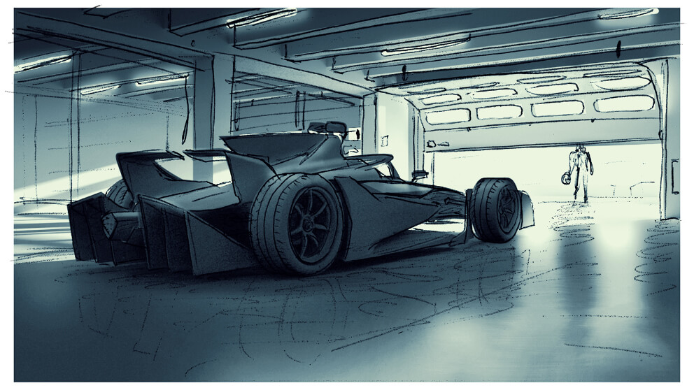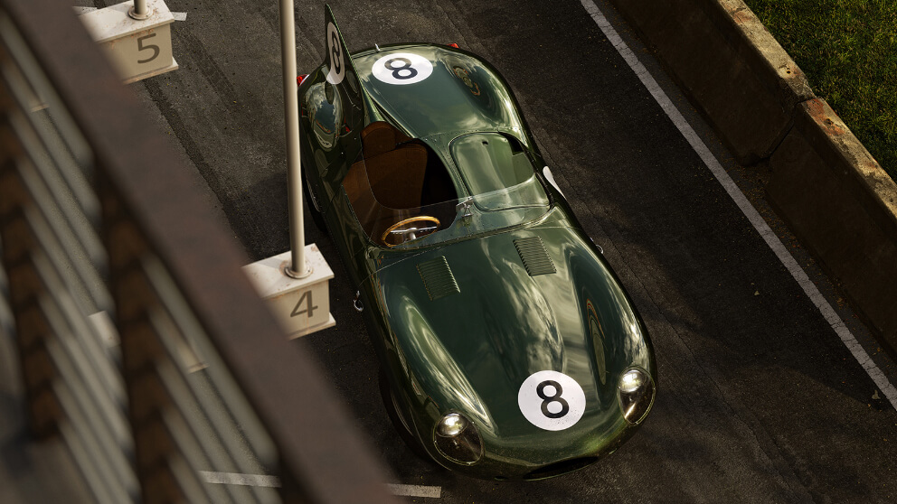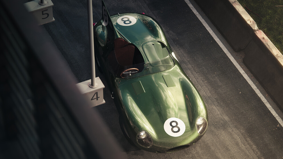I chose the Jaguar D-Type as I believe it's arguably the most elegant, and design driven vehicle produced in the 1950s. To emphasize the shape and lines of the Jaguar, without distraction from a busy scene, I chose a solitary, pit-lane environment.